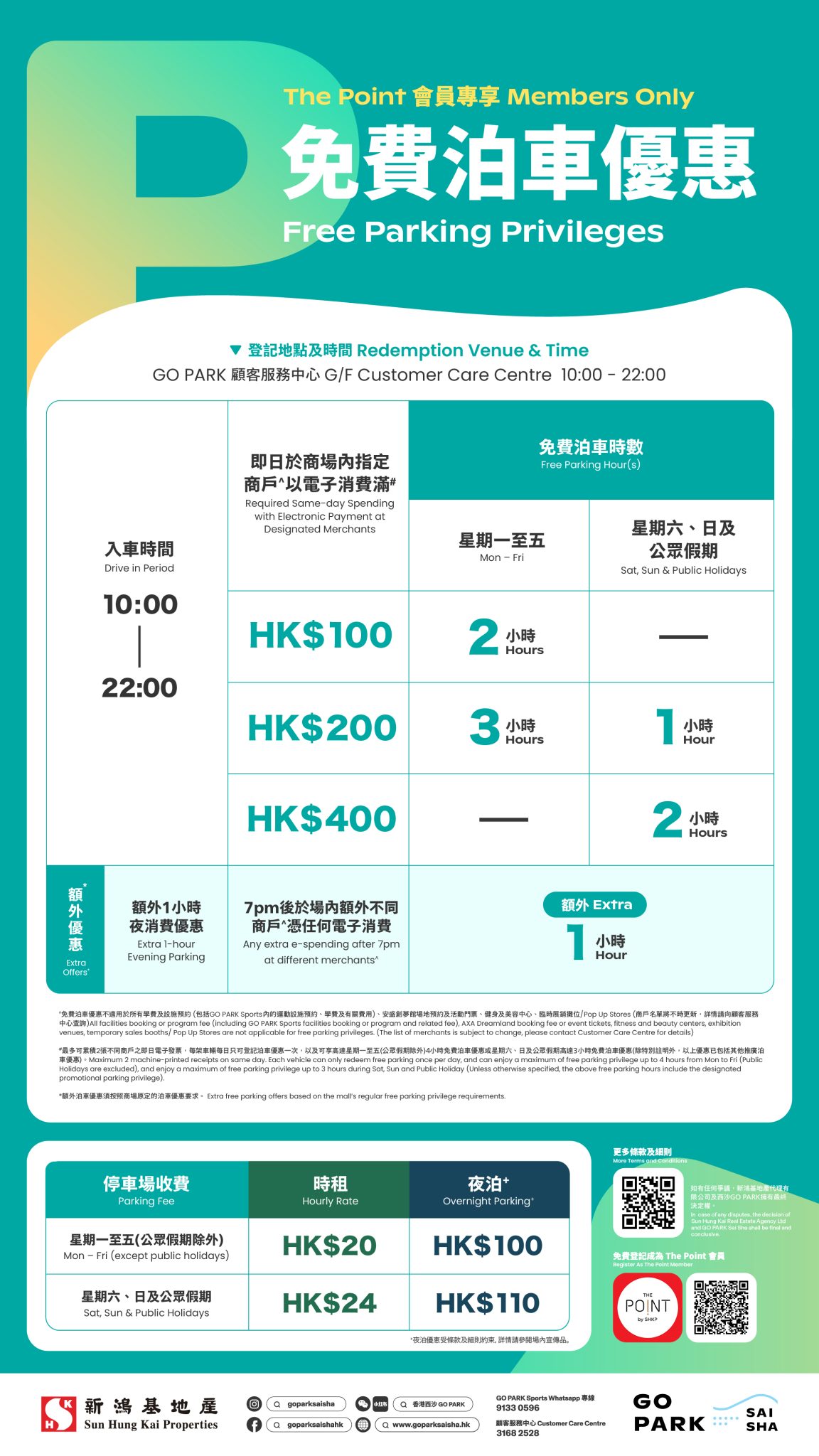 由2026年1月1日起,西沙GO PARK停车场收费将作出时租收费调整:星期一至五(公众假期除外):每小时HK$20 ; 星期六、日及公众假期:每小时HK$24。 西沙 GO PARK 为驾车人士提供方便的泊车选择,让您尽享消闲活动的乐趣! 免费泊车优惠不适用于所有学费及设施预约 (包括GO PARK Sports内的运动设施预约、学费及有关费用)、安盛创梦馆场地预约及活动门票、健身及美容中心、临时展销摊位/Pop Up Stores (商户名单将不时更新,详情请向顾客服务中心查询) 免费泊车优惠只适用于已登记「The Point」会员。 条款及细则